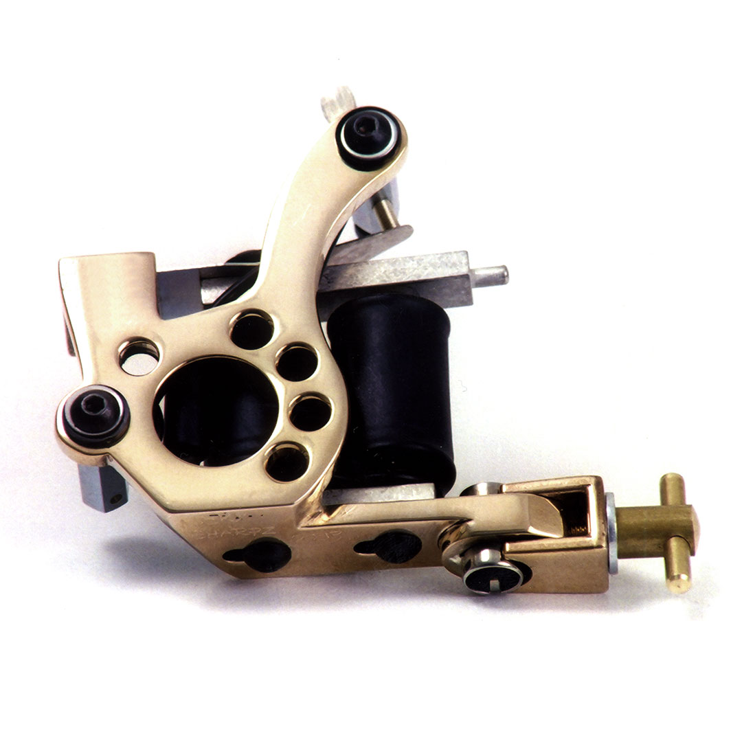 Sharpz Bronze Micro Dial tattoo machine is the ultimate liner with polished bronze finish. This tattoo machine runs like a dream. Featuring – small ‘T Dial’ type frame, cut back for fast positive outlining, high resolution coils. Comes with a split collet quick change device (fast & smooth). A pleasure to use. All individually numbered and registered to the original owner and comes with a Micky Sharpz certificate of authenticity. Beware of imitations!